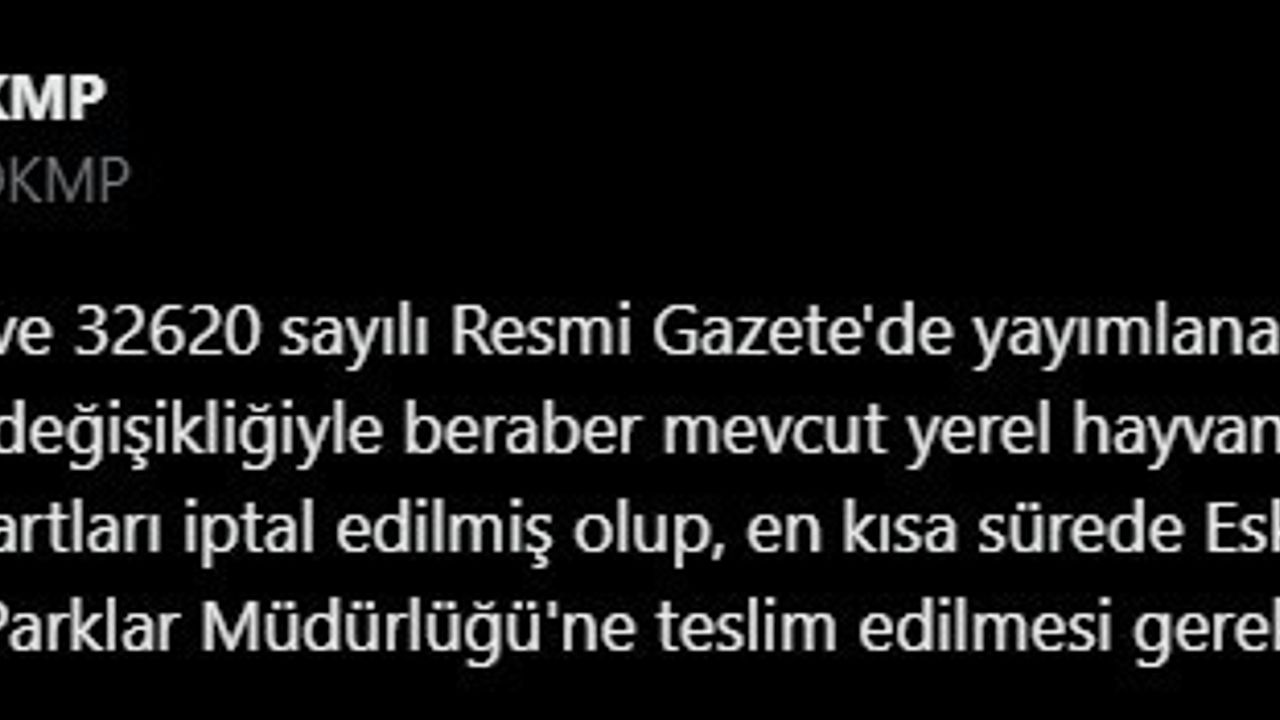 DKMP İl Müdürlüğü, alınan kararı sosyal medyadan duyurdu. Yapılan açıklamaya göre, 02 Ağustos 2024 tarih ve 32620 sayılı Resmi Gazete’de yayımlanan Hayvanları Koruma Kanunu değişikliğiyle beraber mevcut yerel hayvan koruma görevlisi kimlik kartlarını iptal edildi. Kartların en kısa sürede Eskişehir DKMP’ye teslim edilmesi gerektiği belirtildi.
