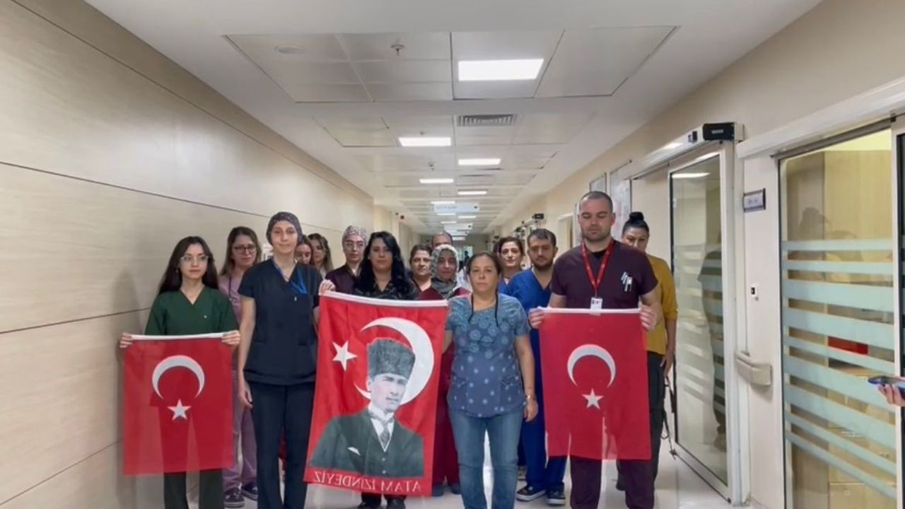 Yoğun bakım servisinde koridorlar ve kapılar bayraklarla süsleyen sağlık çalışanları, hep bir ağızdan İstiklal Marşı okudu.