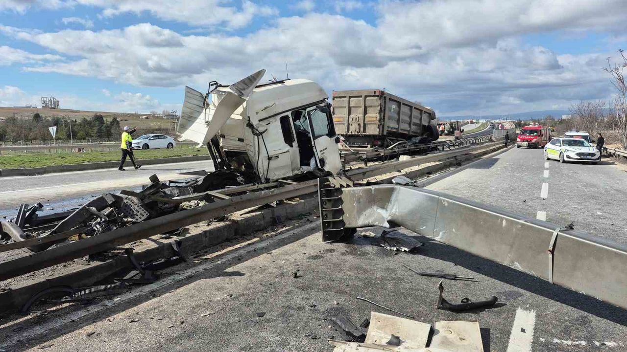 Eskişehir'de kontrolden çıkarak yönlendirme tabelasına çarpan tırın ön kabini koparken, kazayı yaralı olarak atlatan sürücü hastaneye kaldırıldı.
