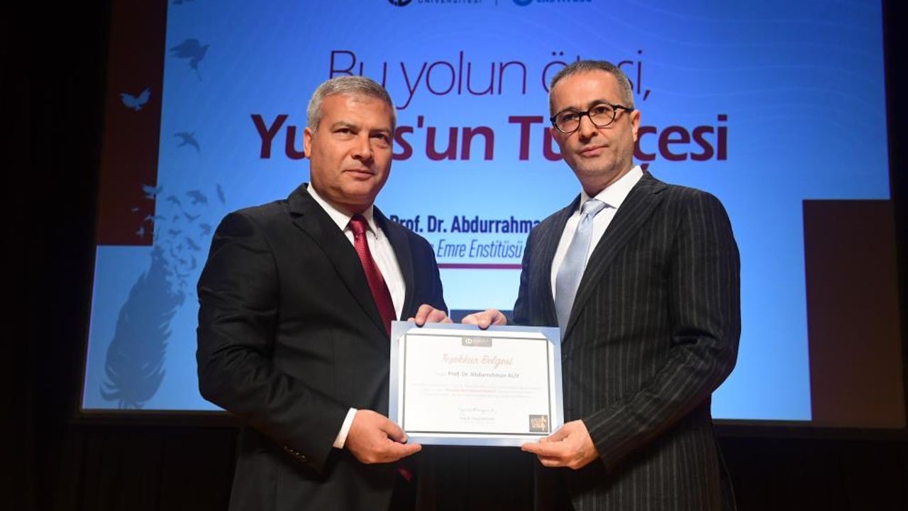 "Bu Yolun Ötesi, Yunus'un Türkçesi" konferansı soru cevap kısmının ardından Anadolu Üniversitesi Rektörü Prof. Dr. Yusuf Adıgüzel tarafından Yunus Emre Enstitüsü Başkanı Prof. Dr. Abdurrahman Aliy'e katkılarından dolayı teşekkür belgesi ve hediye takdim edildi.