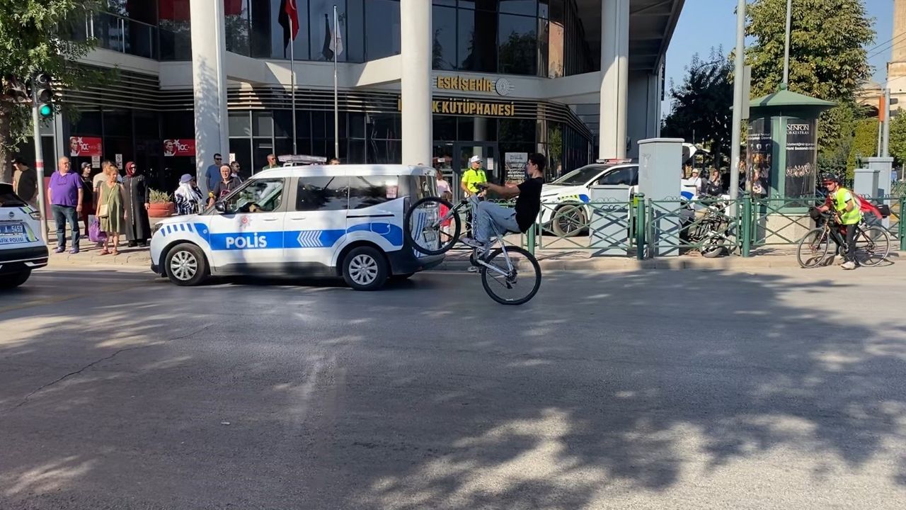 Eskişehir'de 30 Ağustos Zafer Bayramı kutlamaları çerçevesinde düzenlenen bisiklet turu sırasında polislerin gözü önünde tek teker kaldıran genç dikkat çekti.