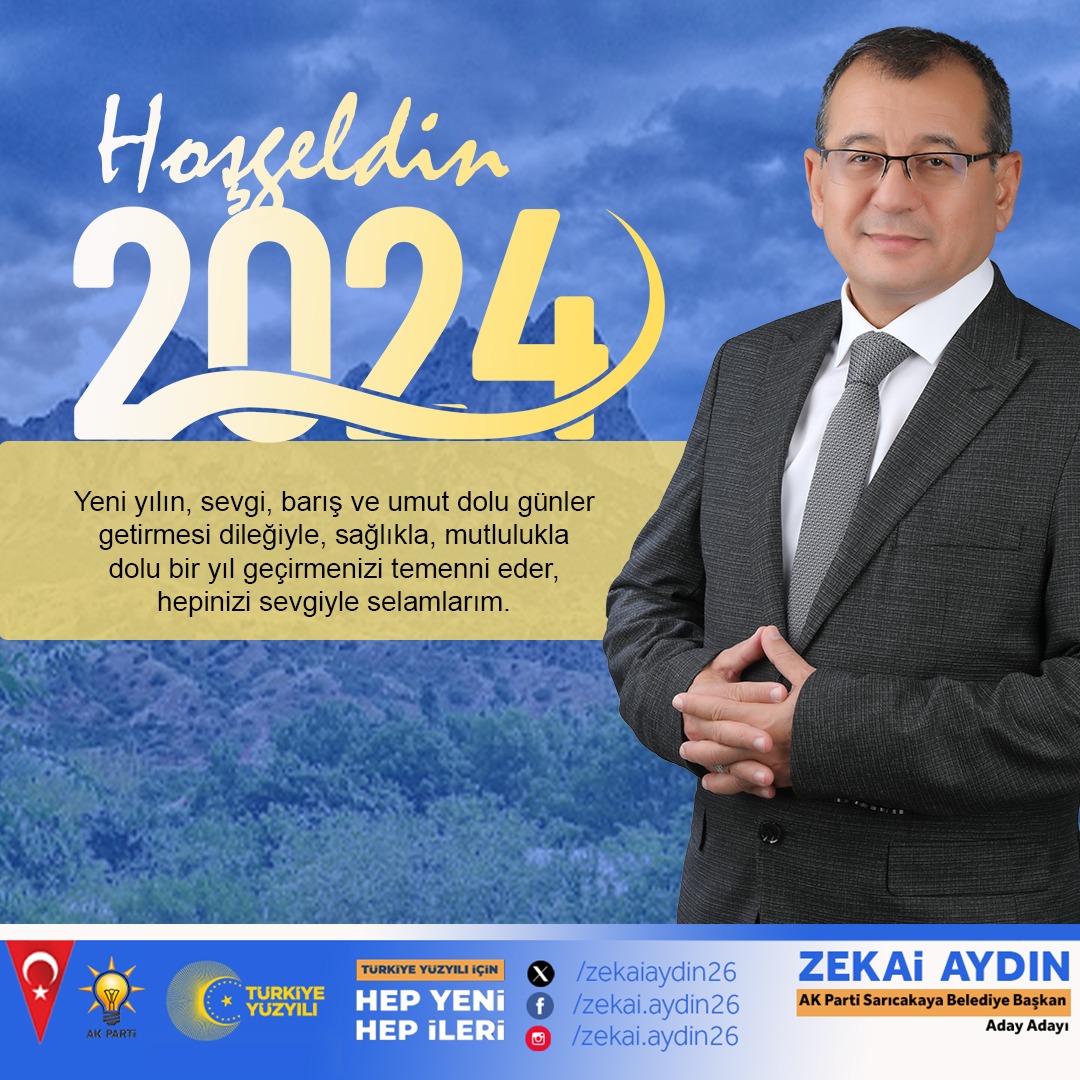 AK Parti Sarıcakaya Belediye Başkan Aday Adayı Zekai Aydın ;Yeni bir yıla girmenin sevinci ve umuduyla, sizlere en içten dileklerimi sunuyorum. 2024 yılı, Ülkemiz başta olmak üzere Eskişehir’imiz ve Sarıcakaya ilçemiz için yeni başarılar, huzur ve refah dolu günlerin müjdecisi olsun dedi.